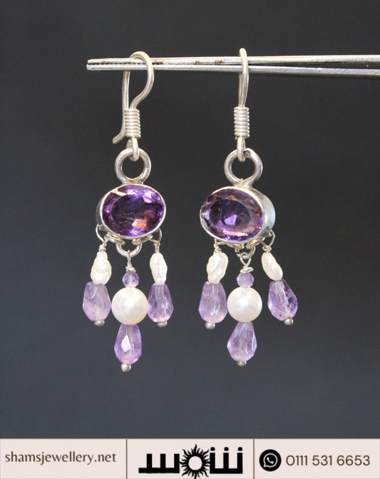 حلق فضة بجواهر أماتيست ولؤلؤ أصلي