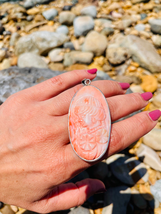 منحوتة كاميو ايطالية مرجان طبيعي دلاية فضة