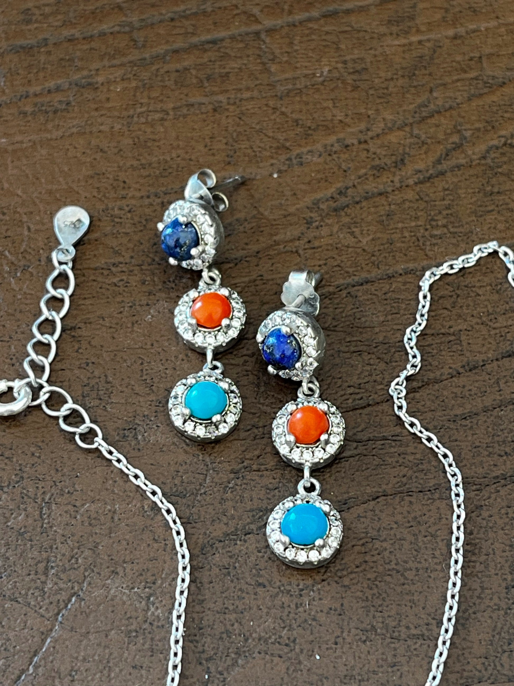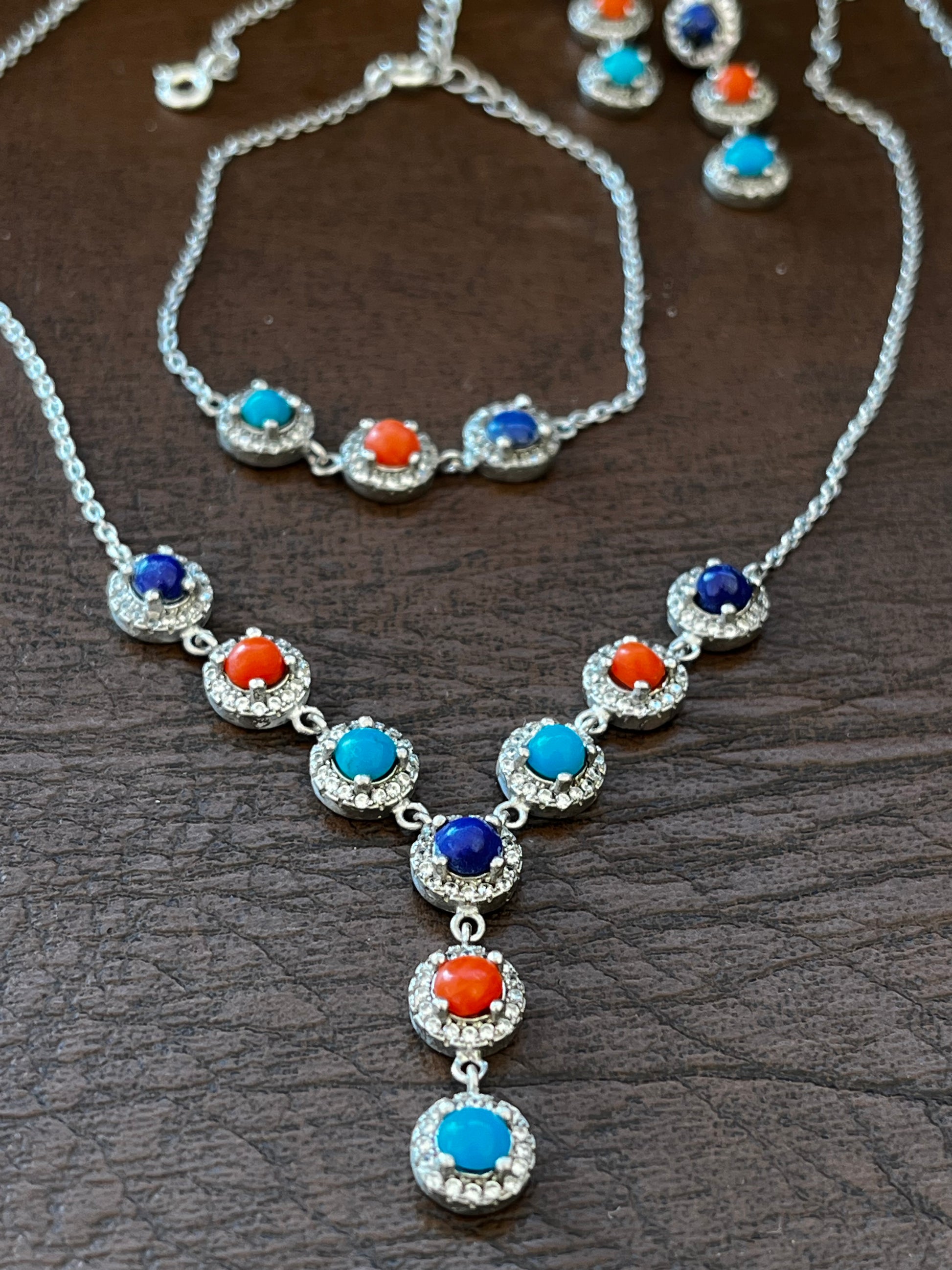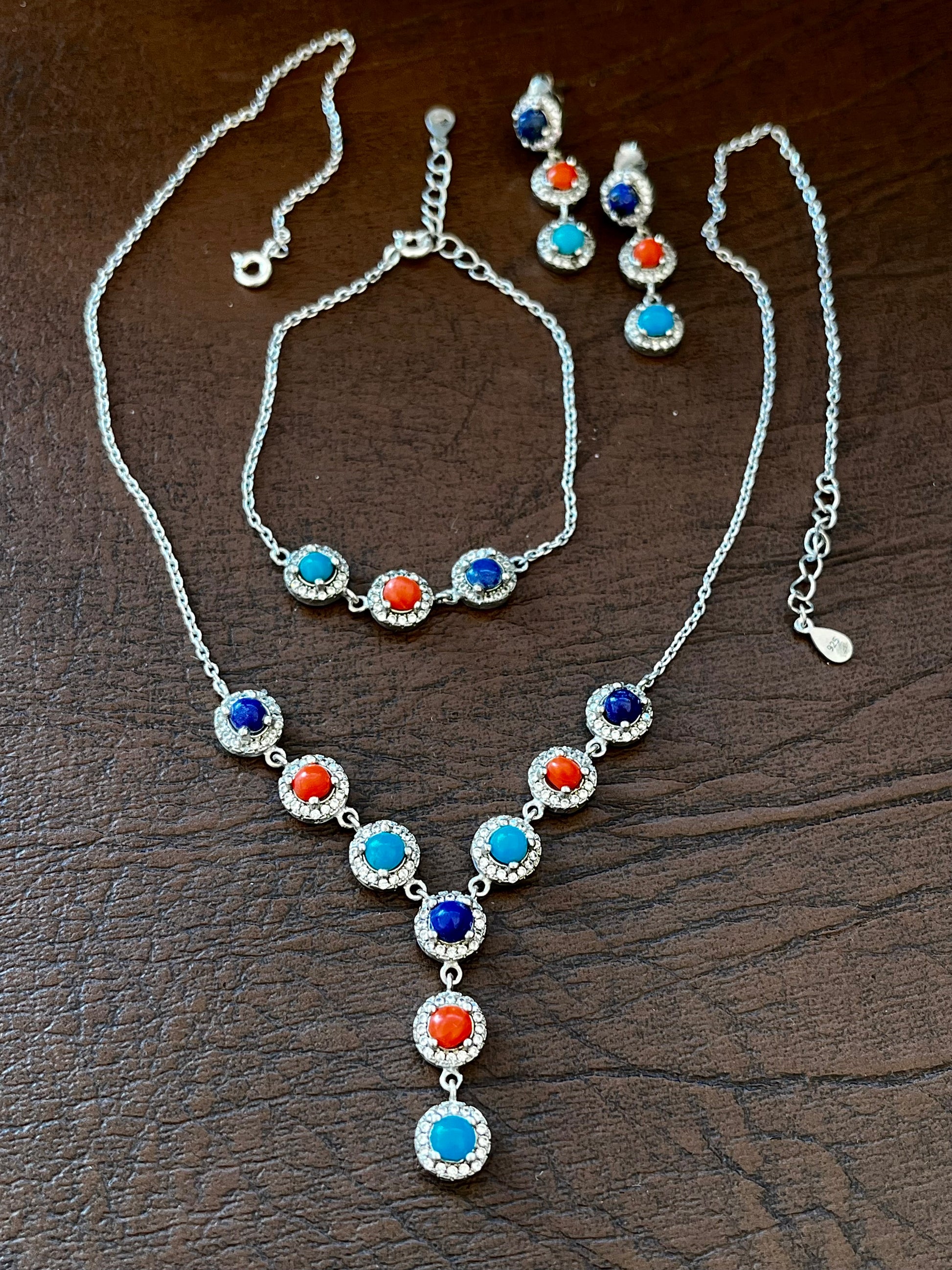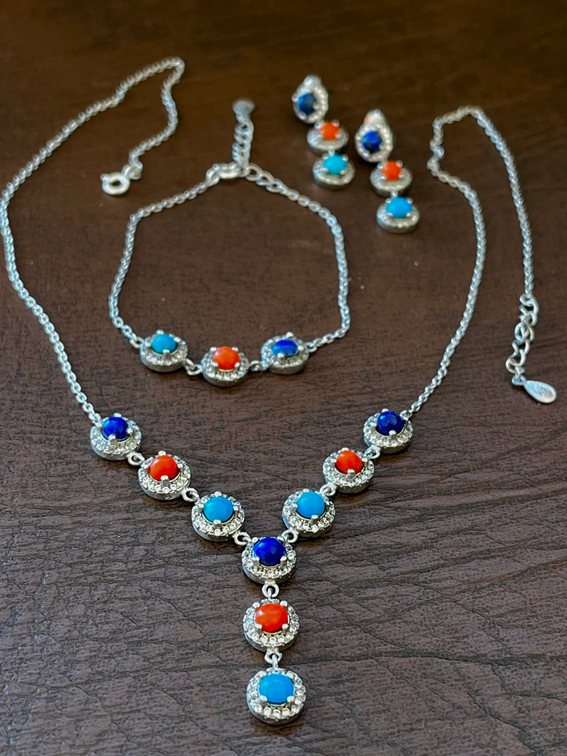 طقم فضة ايطالي أحجار فيروز ومرجان لازورد أصلية