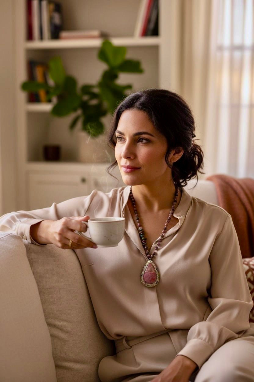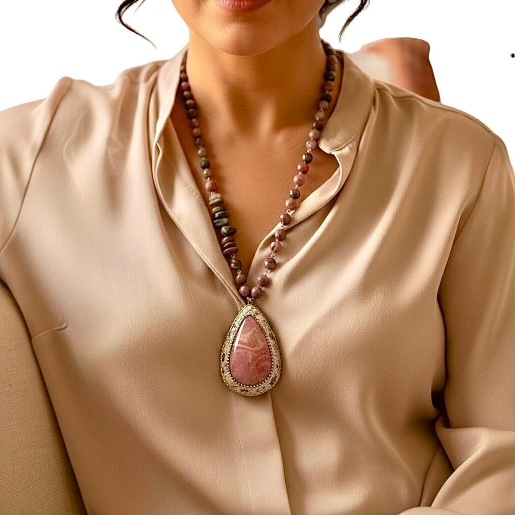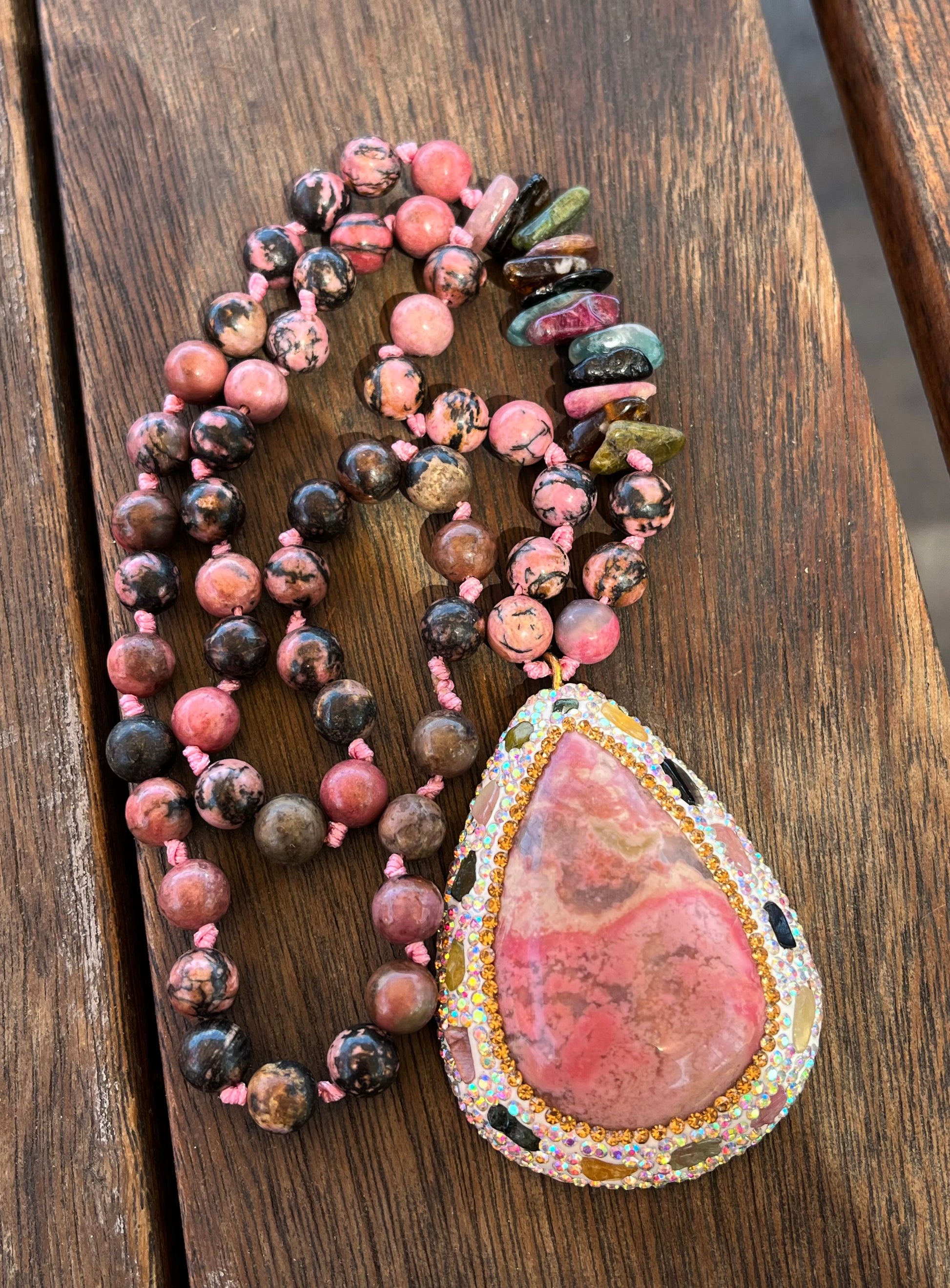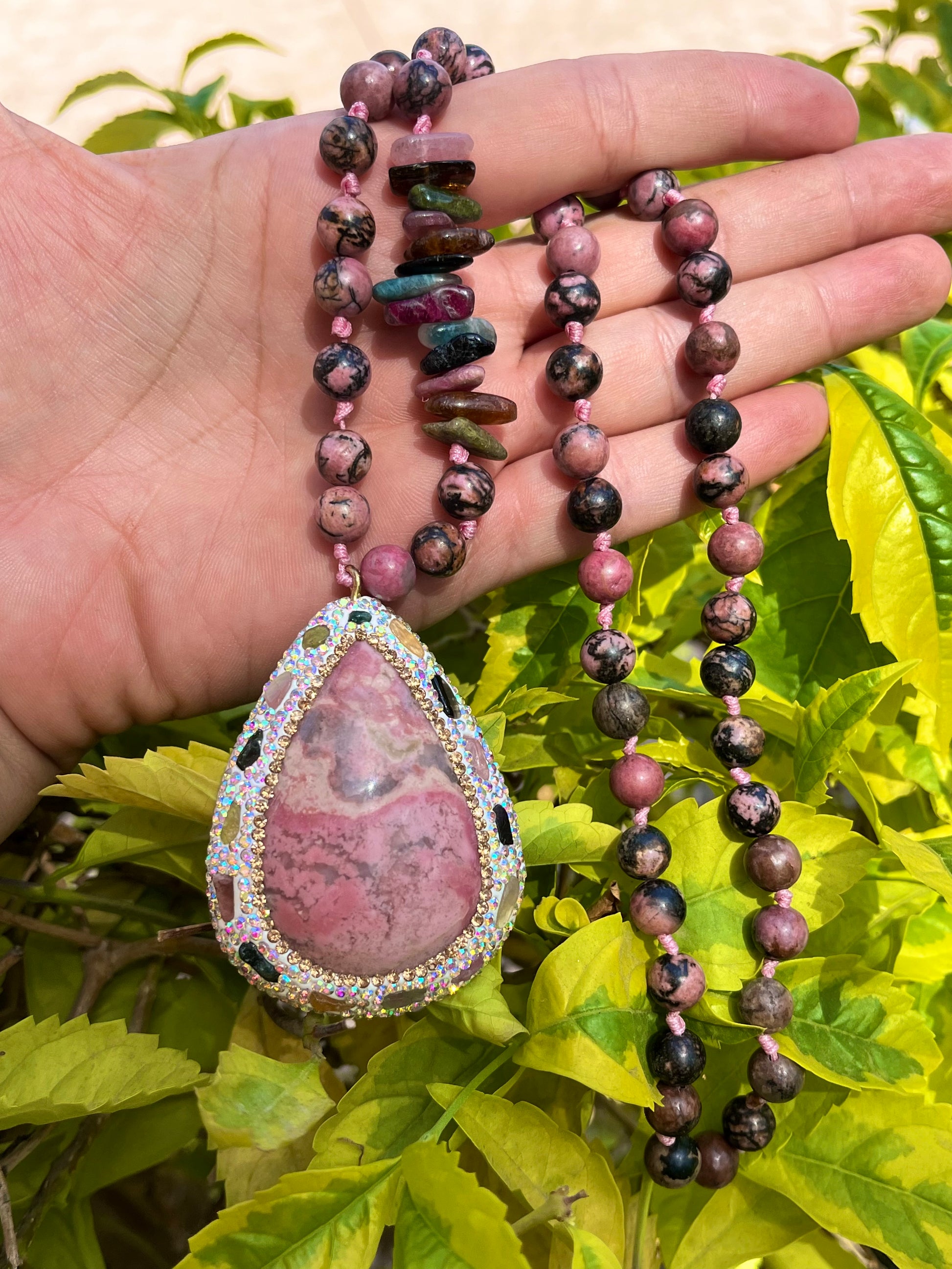 العقد هاند ميد بحبات حجر رودونايت مع حجر تورمالين خام متنوع الالوان