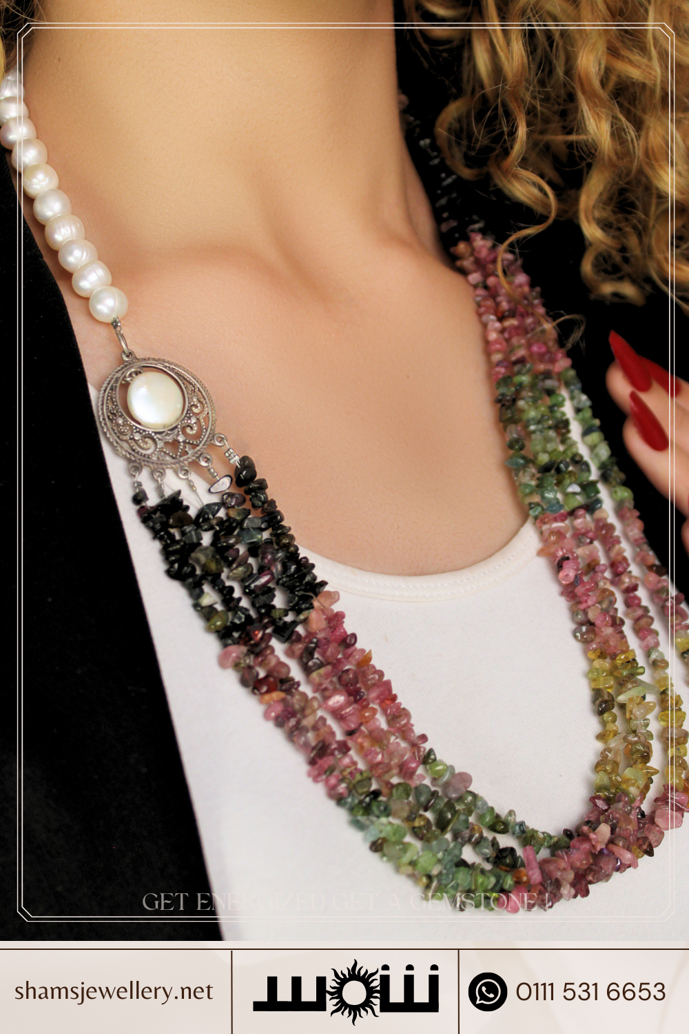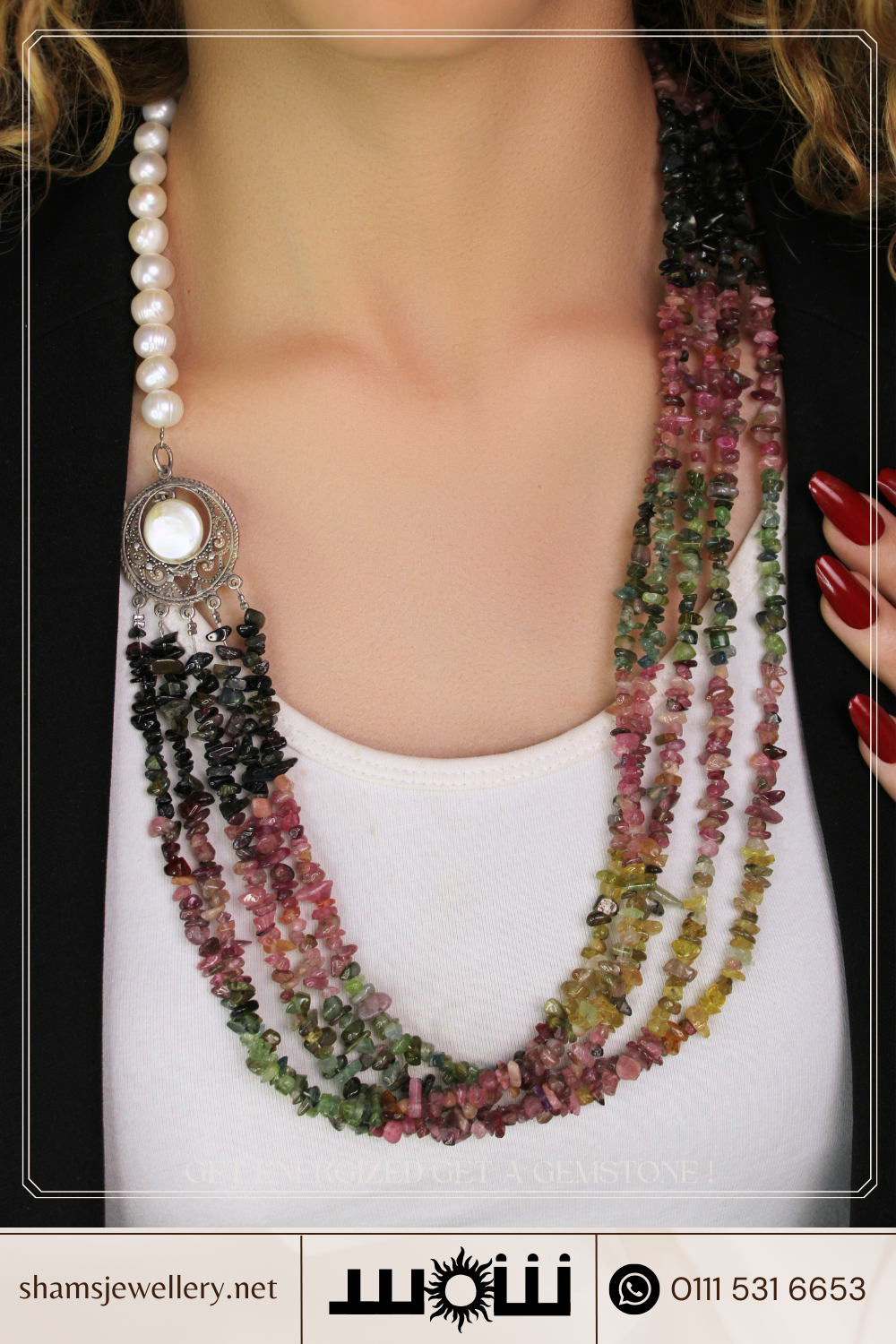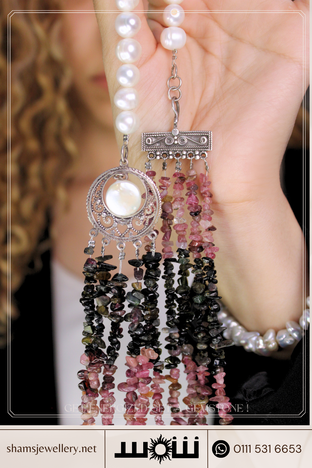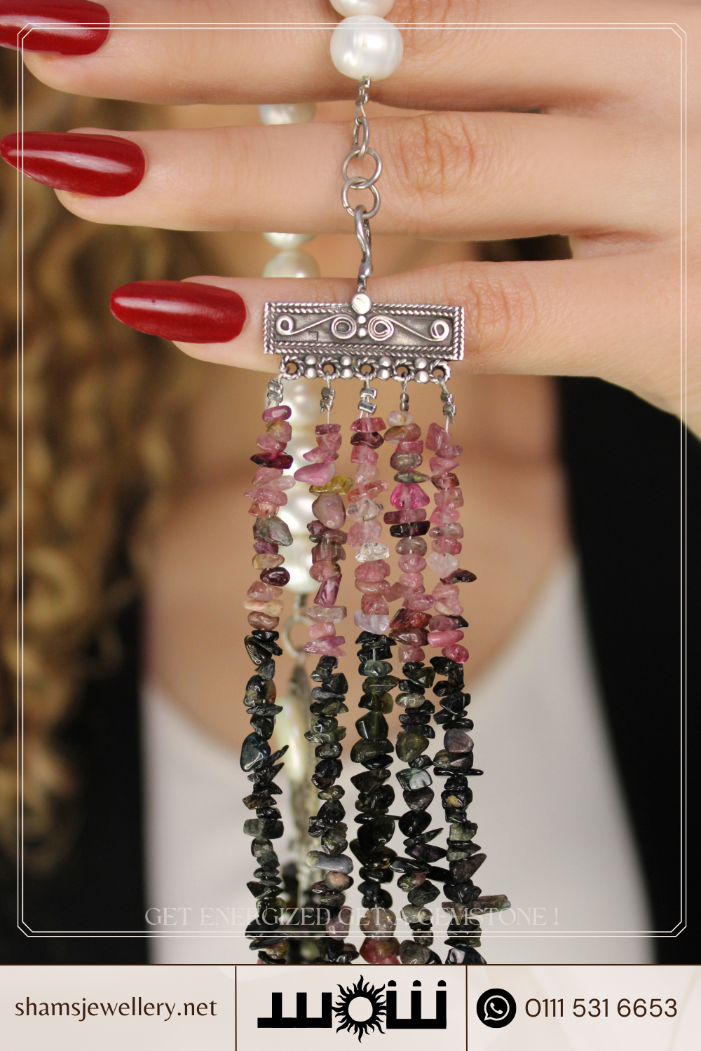 عقد تورمالين ولؤلؤ طبيعي وفضة